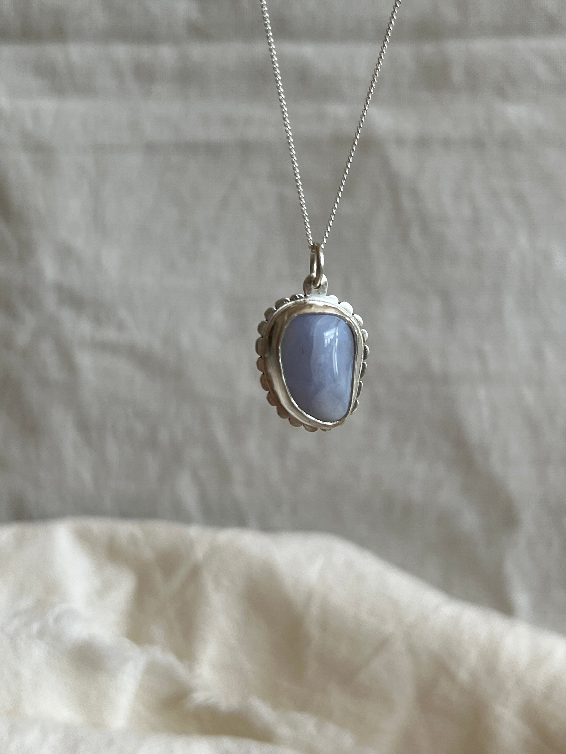 Blue Lace Agate Polished Uncut Stone set in Sterling Silver Scalloped Pendant on a Sterling Silver Chain