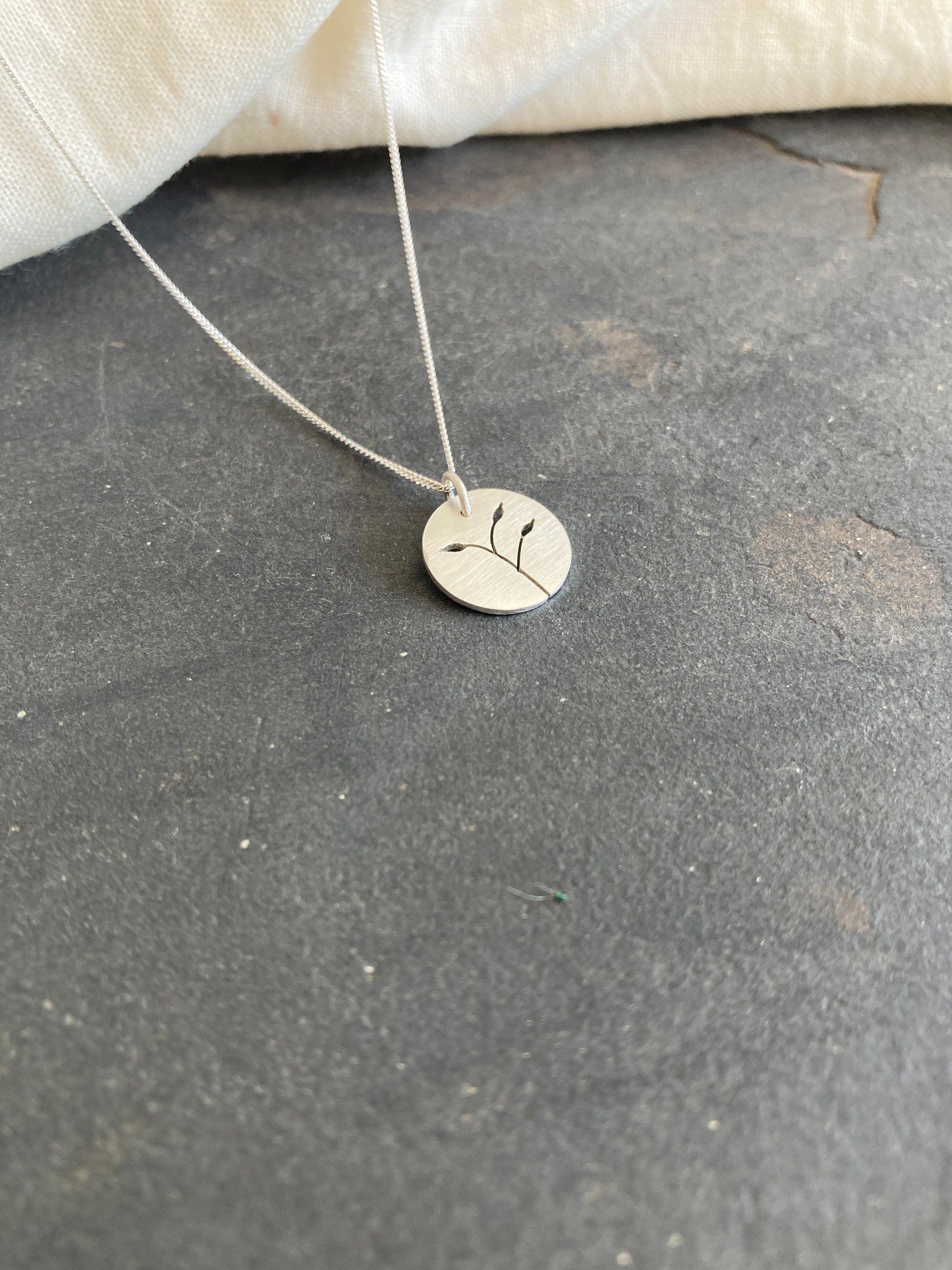 Sterling Silver Round Disc Pendant with botanical design cut-out on a Sterling Silver Chain